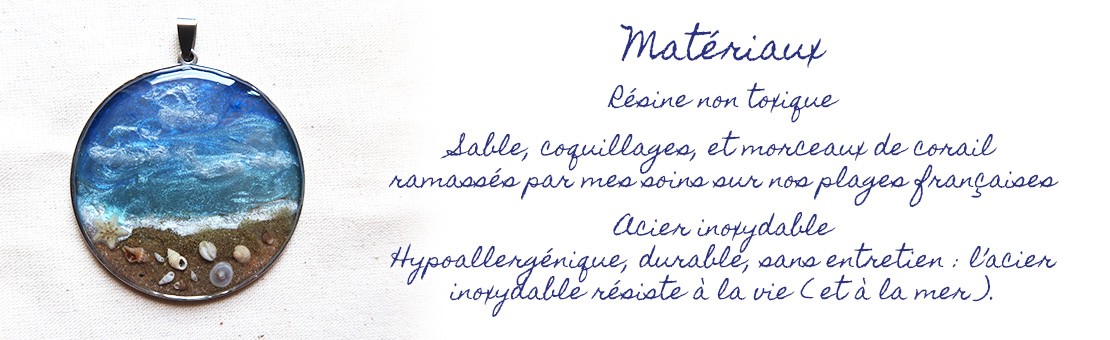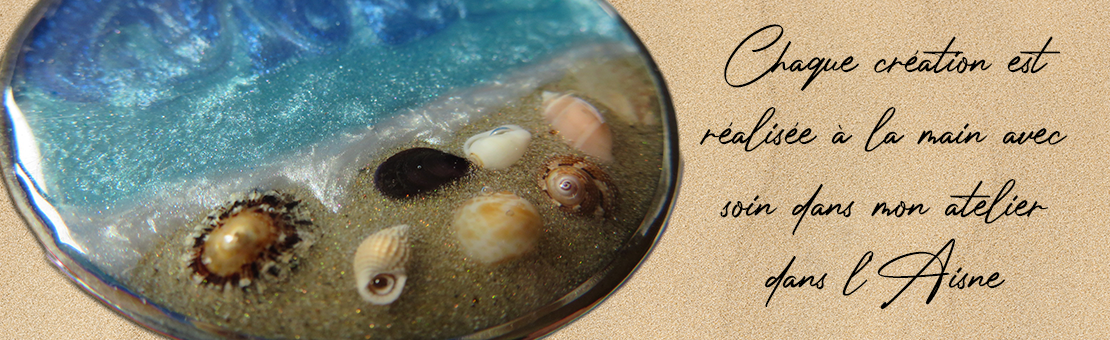 Chaque création est façonnée à la main avec soin, en associant résine, sable doré, coquillages délicats et fragments de corail récoltés sur les plages françaises de l’Atlantique et de la Méditerranée. Ces trésors naturels, glanés au fil des marées, racontent l’histoire de la mer, de ses rivages et de leur beauté sauvage.